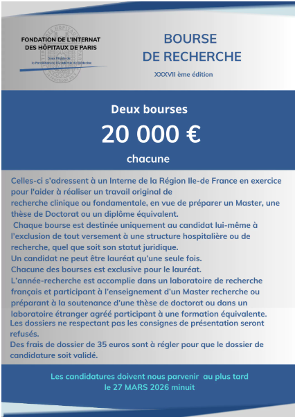 Celles-ci s'adressent à un interne de la région Ile-de- France en exercice, pour l'aider à réaliser un travail original de recherche clinique ou fondamentale, en vue de préparer un Master, une thèse de Doctorat ou un diplôme équivalent.