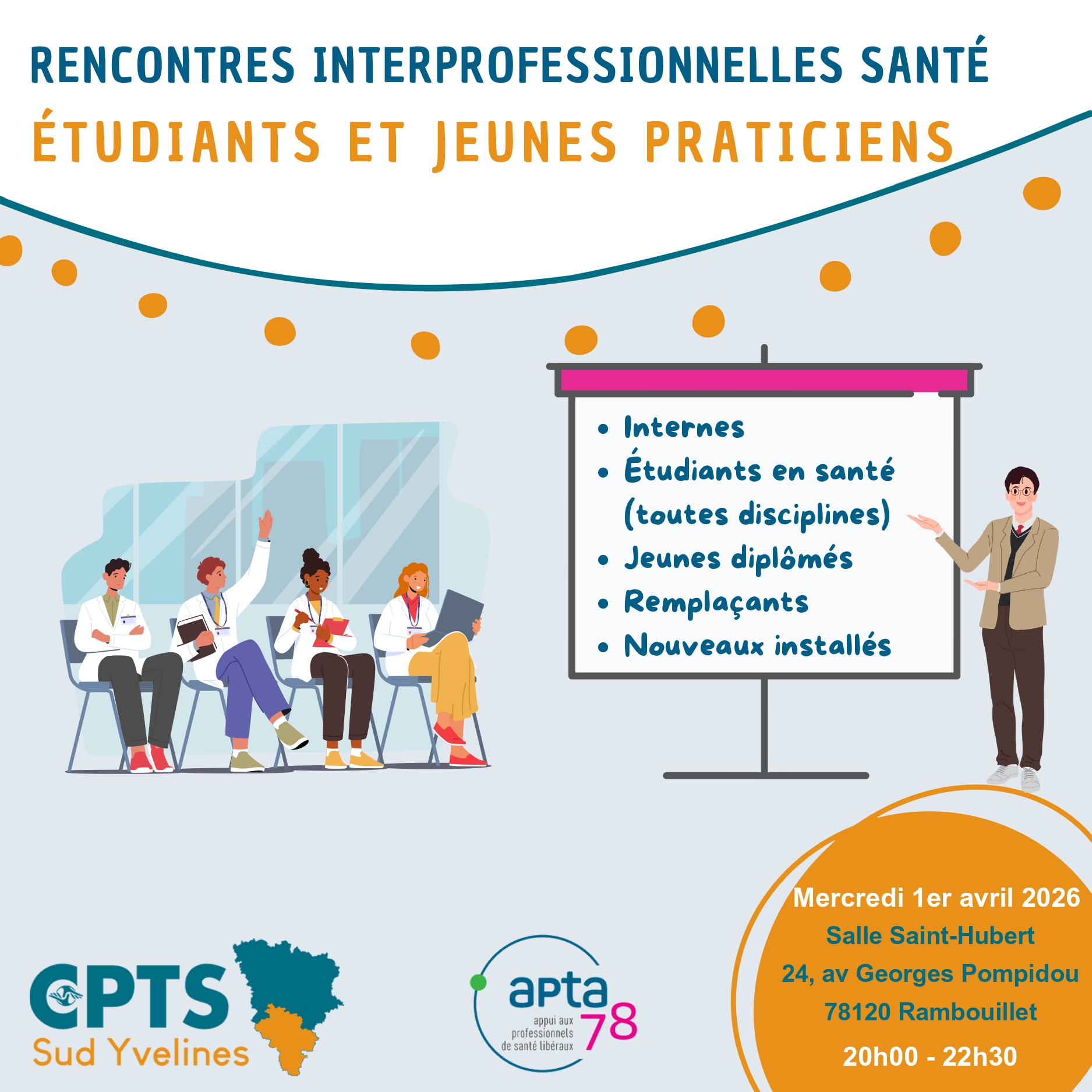 La CPTS Sud Yvelines et l'APTA 78 vous convient pour une soirée dédiée aux internes, toutes spécialités afin d'échanger avec des médecins de ville et hospitaliers exerçant sur Rambouillet et ses environs :