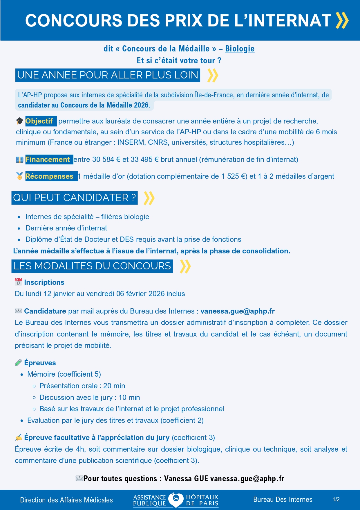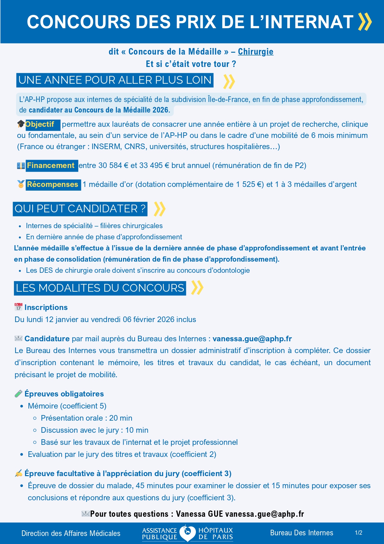 Le Concours de la Médaille est un dispositif de l’AP-HP qui permet aux internes de spécialités d’Île-de-France de bénéficier d’une année de financement dédiée à un projet de recherche clinique ou translationnelle.